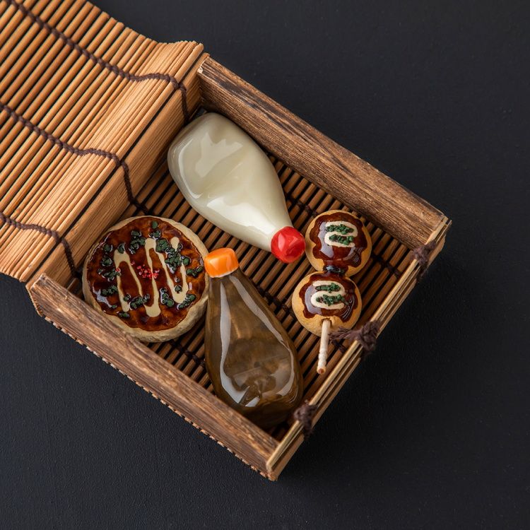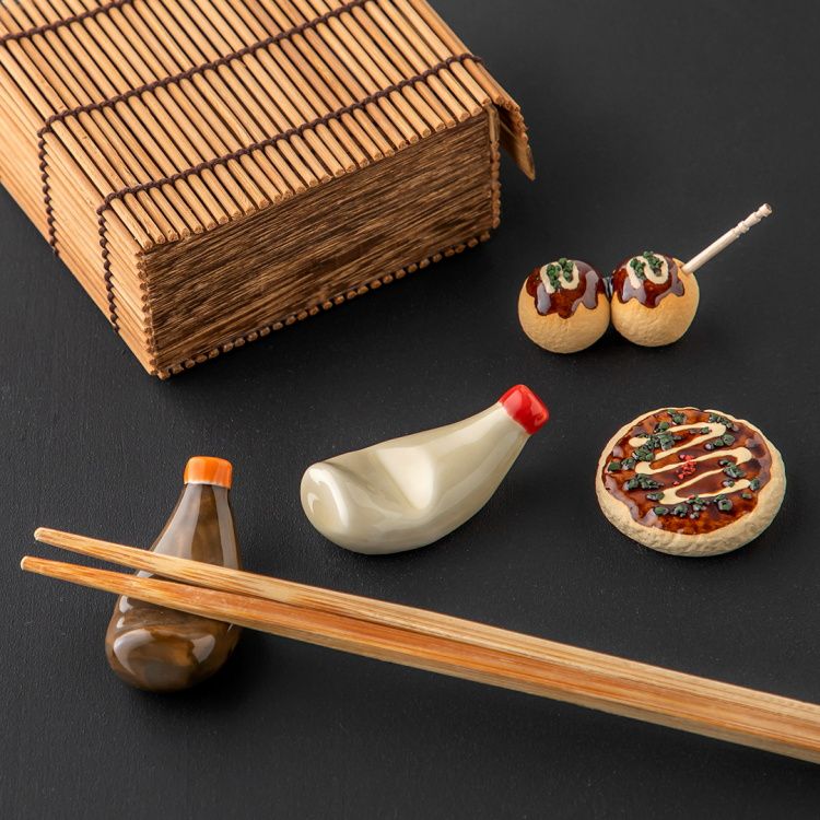 Set of 4 chopstick stands (rests) modeling Okonomiyaki, Japanese pizza, and Takoyaki dishes from Osaka, Japan. The set is most suitable as a present, packed in a gift box.