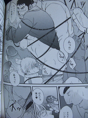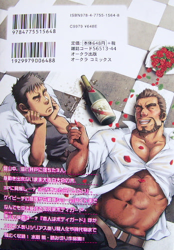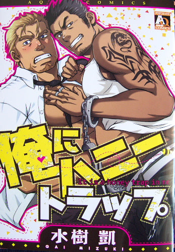 Better translated as “The Honey Trap Inside Me,” this manga by Gai Mizuki contains eight stories of between about 15 and 30 pages each. It starts with “My Lover is a Bodyguard”: a salaryman/jock fantasy with lots of locker room-style violence and a little bit of suit and tie bondage. This sets the scene for the remaining seven stories, which all feature young, hard, muscled and hung protagonists, in modern or ancient settings, Japanese or Western, swordfighting, punching, throttling and wrestling each other into submission, and completing the various takes on the final task with grunts and howls, thick cocks, and loads of cum.