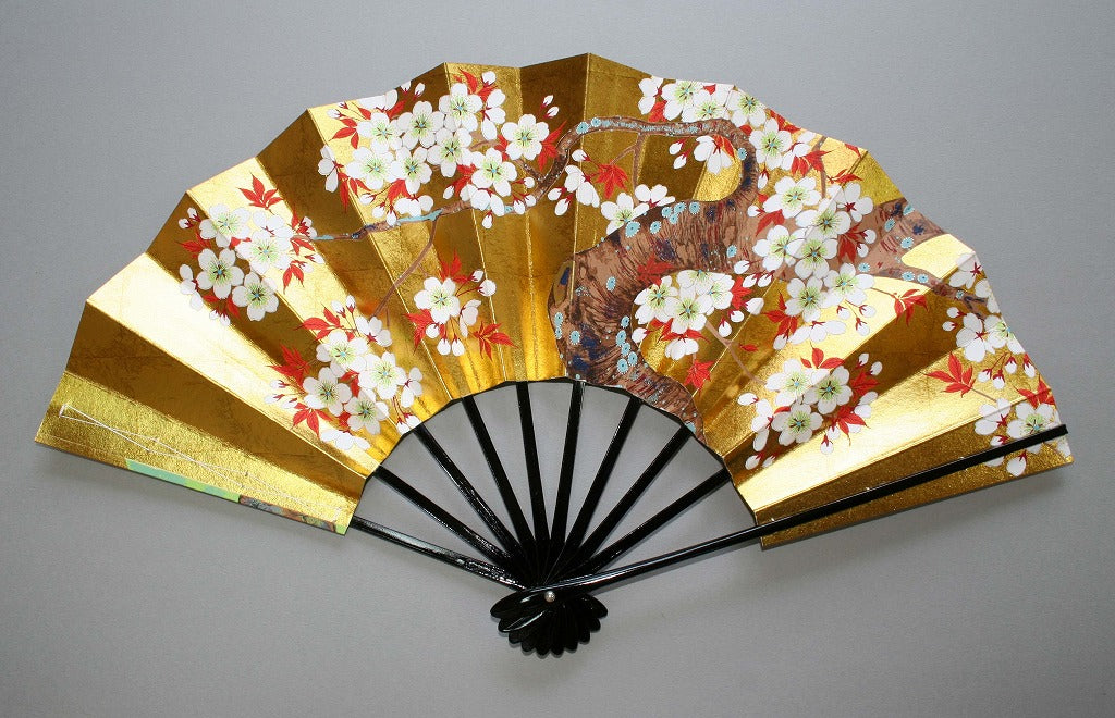 The Japanse maple and cherry tree fan is a hand-made Japanese dance fan. Handpainted on washi paper in Kyoto, it features a traditional a design.