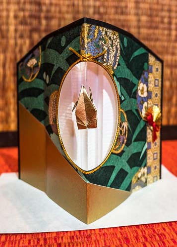 Comes with insert and envelope. 11 cm x 12 cm with a hanging origami crane.