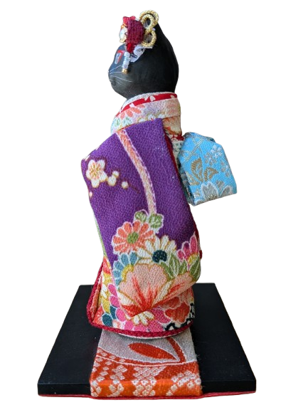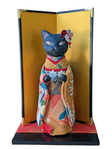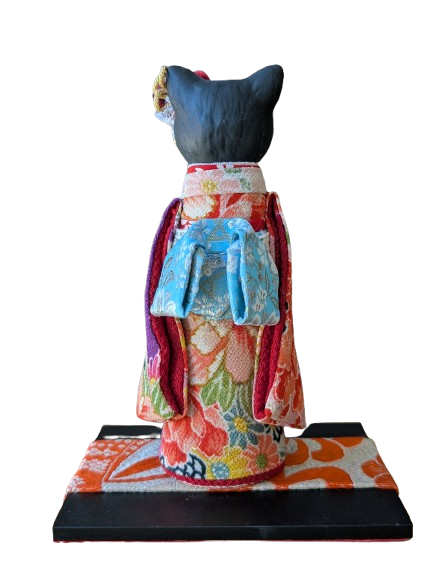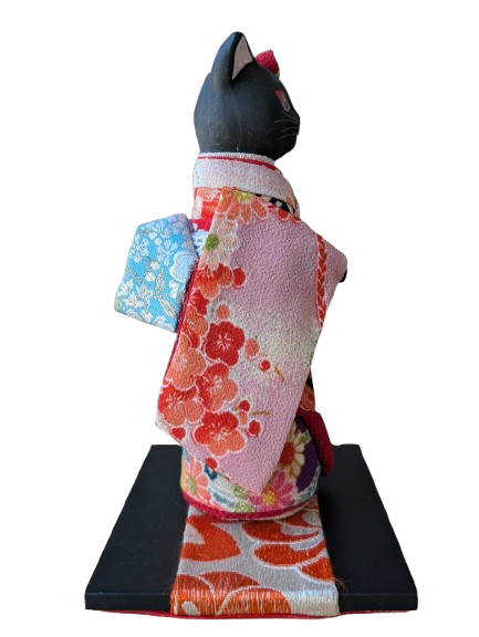 This beautiful piece is hand made and painted by a traditional ceramics company in Seto, Aichi. The history of the company goes back nearly a century. An expression of Japanese beauty, these kimono maneki neko are produced by a skilled and dedicated team. One artist produces the maneki neko cat, another the kimono.