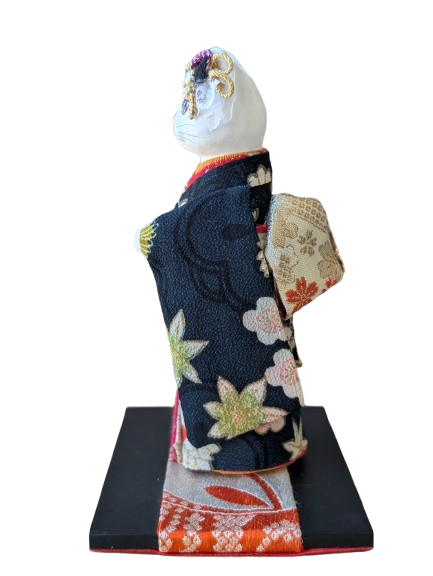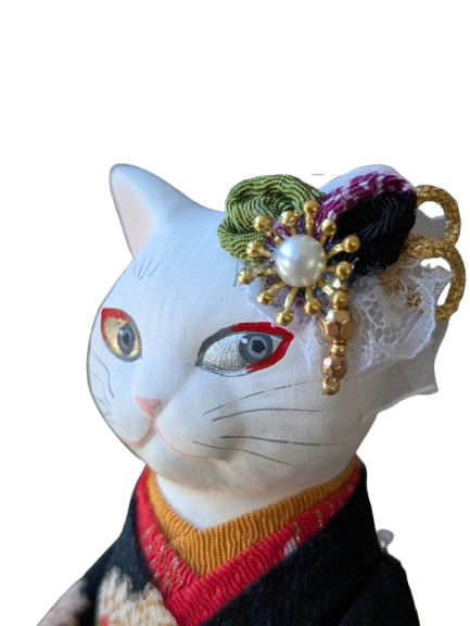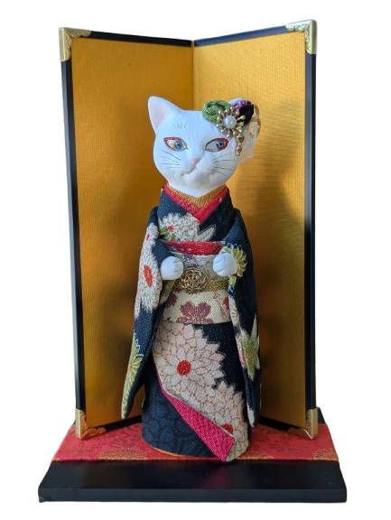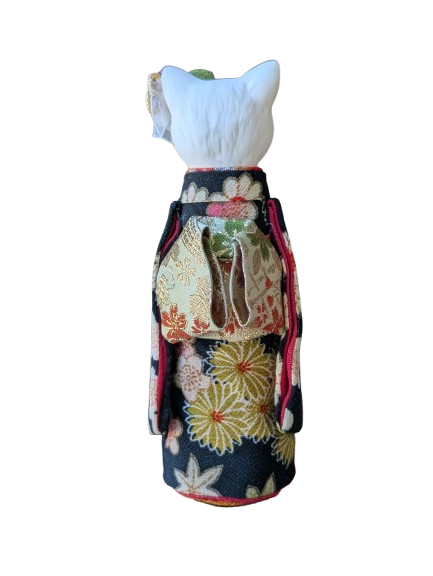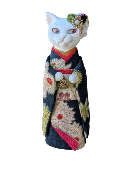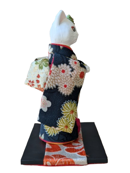 This beautiful piece is hand made and painted by a traditional ceramics company in Seto, Aichi. The history of the company goes backnearly a century. An expression of Japanese beauty, these kimono maneki neko are produced by a skilled and dedicated team. One artist produces the maneki neko cat, another the kimono.