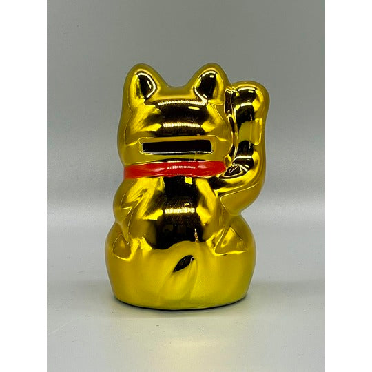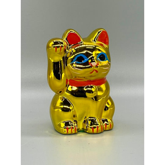 A top quality miniature maneki neko beckoning cat, in gold, beckoning with its right paw. Improve your fortunes in life.