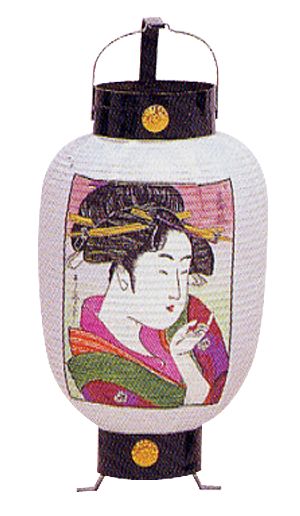 This colorful, geisha (geiko) lantern is a symbol of Kyoto. The image is from a classic Edo Period woodblock print.