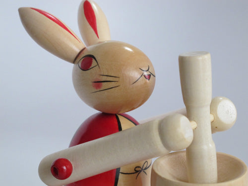 This beautifully shaped and painted Japanese toy is called usagi-no-mochiya. Usagi is rabbit and a mochiya is a person who makes rice cakes.