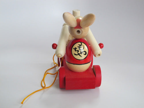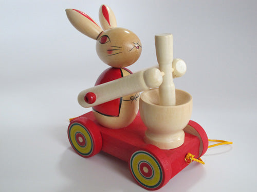 As you pull the toy with the cord the rabbit moves on its wheels and pounds the rice with a wooden stick.