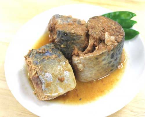 3) Black - mackerel simmered in soy sauce and beet sugar.