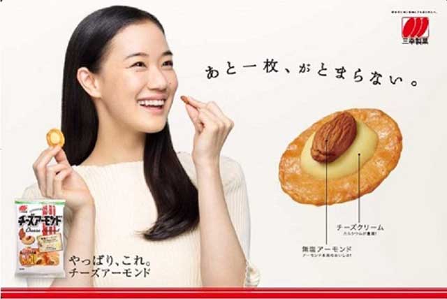 Ingredients: almonds, glutinous rice, whey powder (including milk components), vegetable fats and oils, cheese powder, starch, defatted milk powder, sugar, soybeans, dextrin, bonito extract, lactose/processed starch, emulsifiers, seasonings (amino acids, etc.), colorants (carotene, paprika pigments), fragrances, antioxidants (vitamin E), spice extracts.