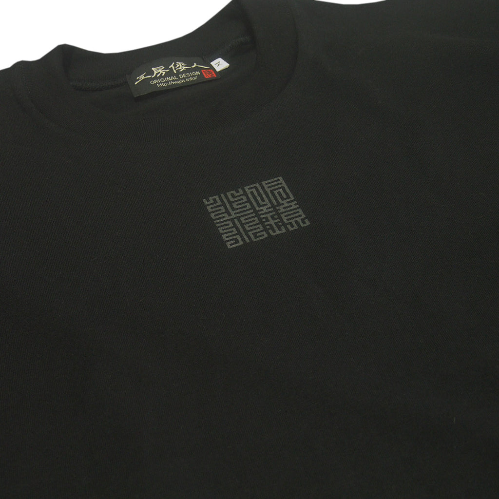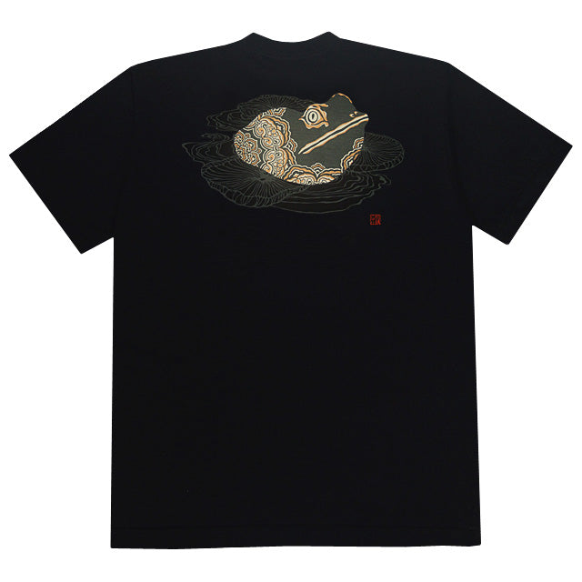 Design of a humorous frog that stares at one point. Colorful 'YUSHOKU' – traditional design motifs of court nobles – and, lotus leaf and streams by line drawing, while using traditional materials, it became very new design with cool & exotic atmosphere. The characters on the front means 'The heart staying quiet and clear'.