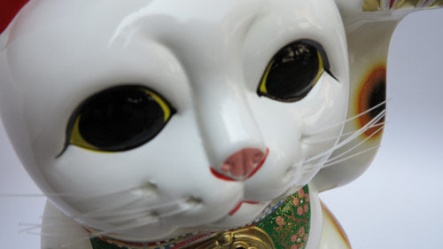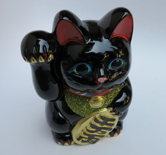 The small koban maneki neko is 16cm (6 inches) tall and comes in black or white with right or left arm raised. Maneki neko are good luck beckoning cats found in homes or businesses throughout Japan. The large sizes of maneki neko in this series have whiskers, the small and medium sizes do not.