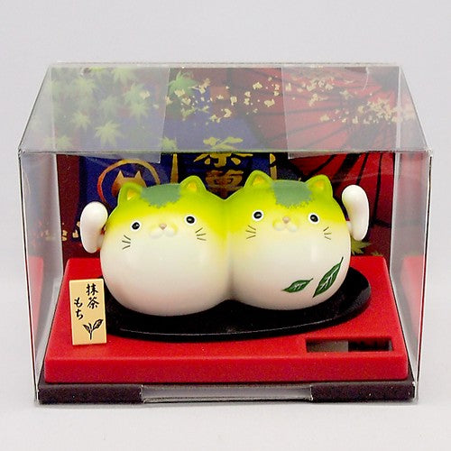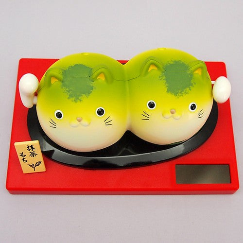 This pair of lucky solar maneki neko are in the shape of matcha mochi (green tea rice cakes).