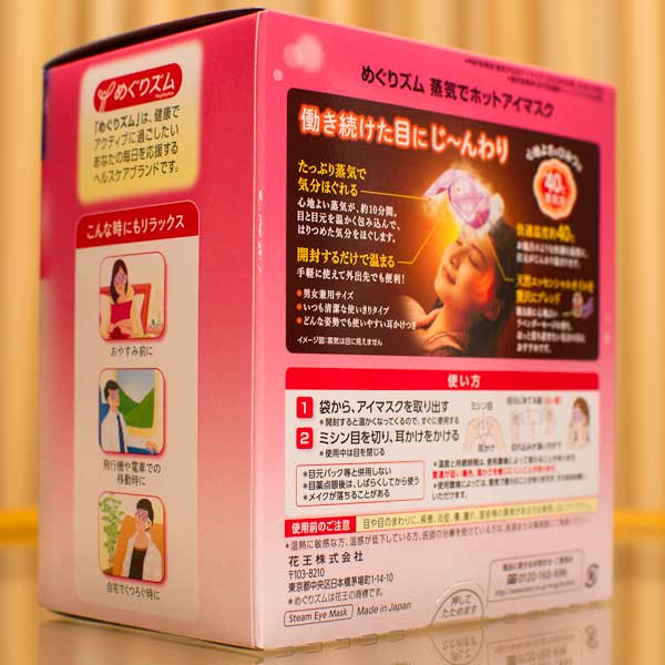 These made-in-Japan eyemasks create a blissfully warming, moisturizing temperature of 40 degrees Celsius (100 degrees Fahrenheit) - the same warmth as a nice hot bath. The heat relaxes your eyes and, by extension, your whole being, for a full 10 minutes or more.