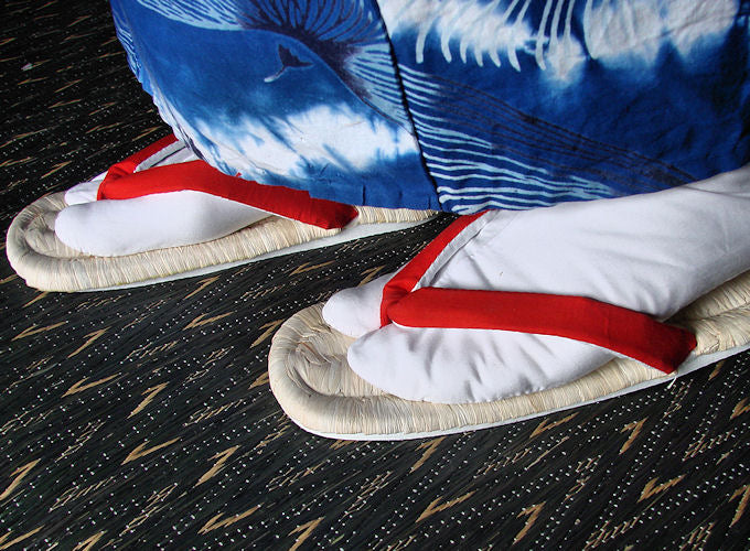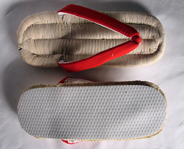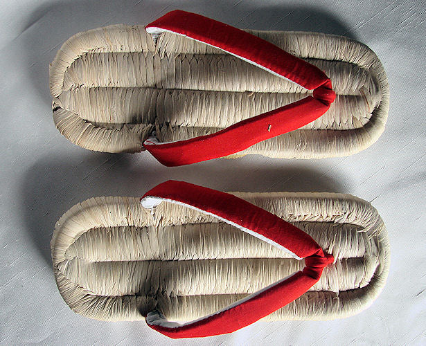 Made of tatami-style woven straw in two panels with red velvet thongs.