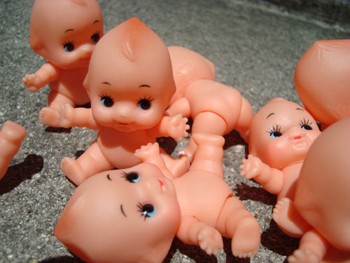 These charming, sitting Japanese kewpie come in sets of 10. These 5cm (2 inch) (when standing) kewpies can both sit and stand. The head, arms and legs all revolve.
