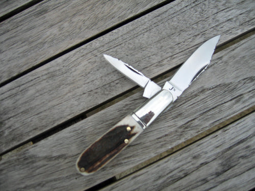 The knife is hand made from high polished steel and brass. The handle is in hand selected stag antler with brass pins. It is a precision razor sharp piece that works firmly yet smoothly. The knife is slightly over 3.25 inches long closed and 5.75 inches fully open.