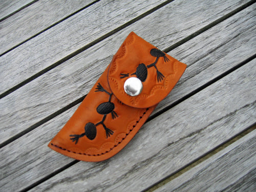 It is a dazzling Rolls Royce of a pocket knife. It comes in a heavy duty leather hand crafted tooled case/sheath with pine branch motif in relief. It is designed to hold the knife snugly and safely and fit onto up to a 2 inch belt. You will be amazed how perfect and beautiful this. It is almost certainly one of the nicest pocket knives ever from the workshops of James Noble.
