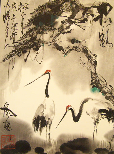 Standing Cranes depicts that most mythical of Oriental birds, cranes, standing alone in a wintry river scene.