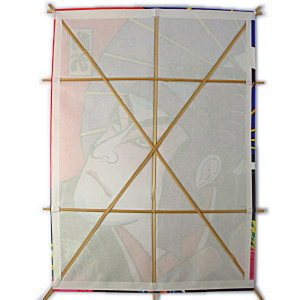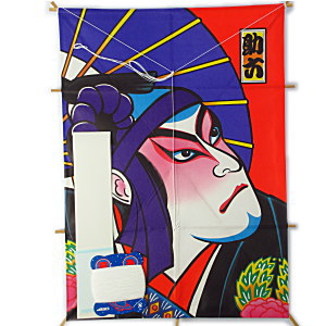 This colorful Japanese paper-and-bamboo kite pictures "Sukeroku" a hero of kabuki dramas.