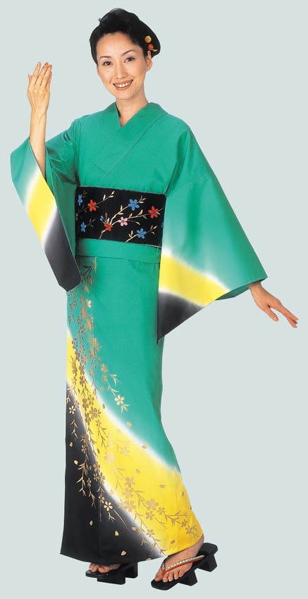 This deluxe Japanese yukata comes in a three color design: black, green and yellow with a flower motif in gold.