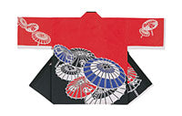 The umbrellas happi is lively and festive and colorful. The main colors are red, black, and blue. All cotton. Design also available in blue and yellow.