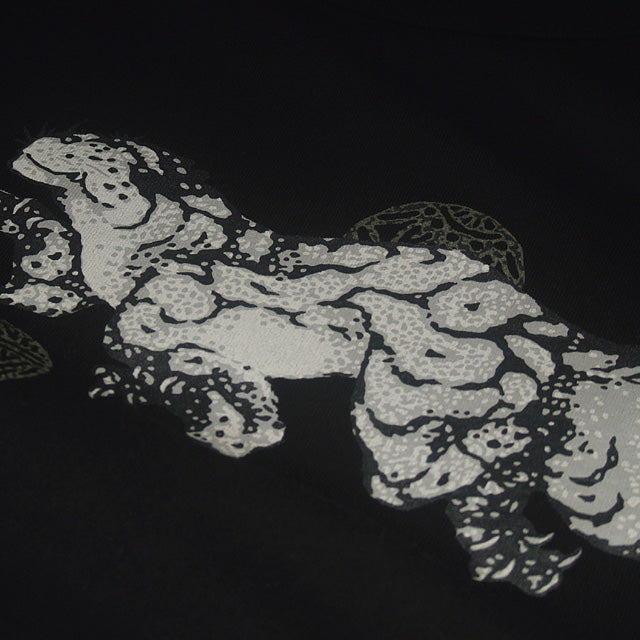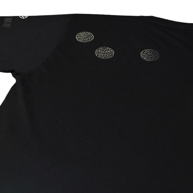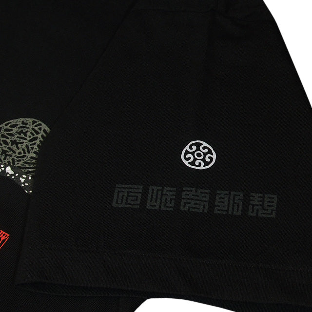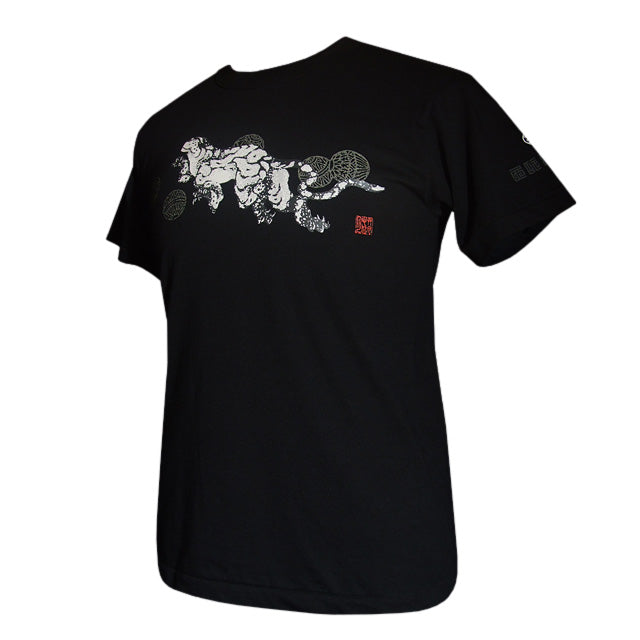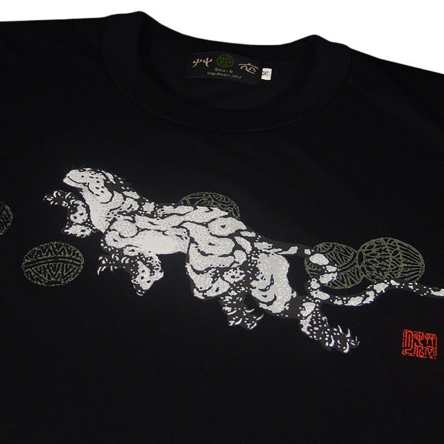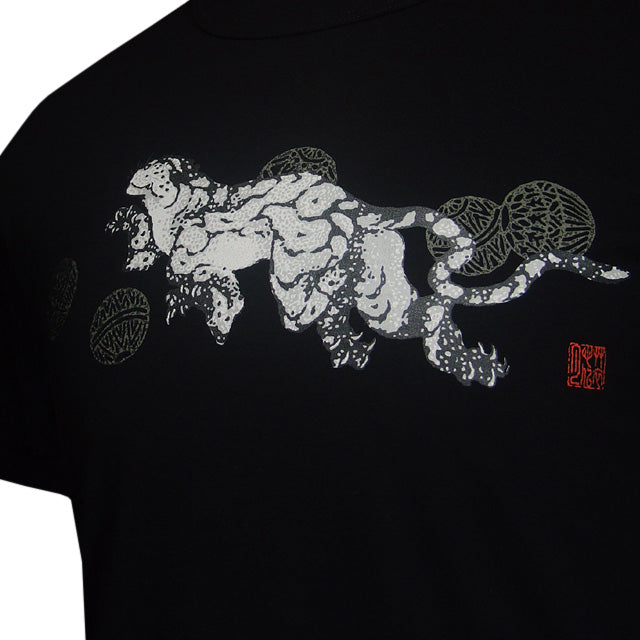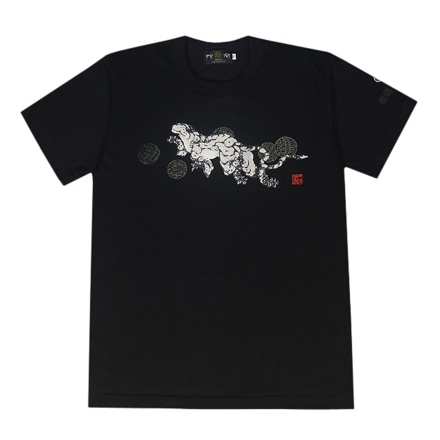 Feel the air of a fantastic world created by a tiger playing with Japanese temari balls. Square characters on the left sleeve read: It is not sure whether this world is a dream or reality.